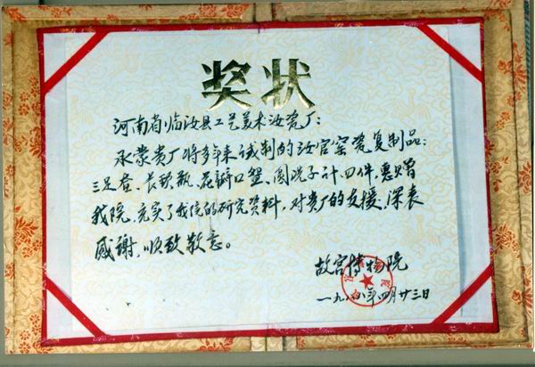 1983年她和郭遂師傅一起研究恢復(fù)成功了汝窯天蘭釉,獲河南省科技成果獎。