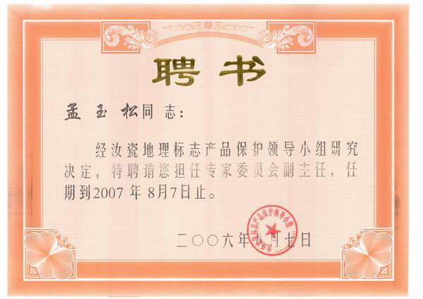 孟玉松同志一貫熱愛黨、熱愛祖國,在自己的工作崗位上兢兢業(yè)業(yè)、刻苦專業(yè)業(yè)務(wù)技術(shù),為汝瓷的恢復(fù)和發(fā)展做出重大貢獻。