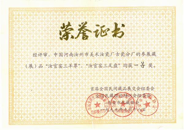 1999年她制作的汝瓷三羊尊和三足盤獲全國首屆民間藏品展交會一等獎。