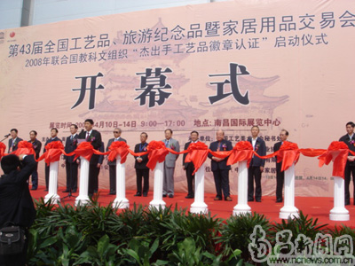 南昌新聞網(wǎng)訊(記者 江莉)今日(10日)上午,第43屆“全國(guó)工藝品、旅游紀(jì)念品暨家居用品交易會(huì)”在南昌國(guó)際展覽中心舉行了開(kāi)幕儀式。湖北省工藝美術(shù)協(xié)會(huì)名譽(yù)理事長(zhǎng)、原湖北省委書記蔣祝平,上海市工藝美術(shù)協(xié)會(huì)名譽(yù)理事長(zhǎng)、原上海市人大常委會(huì)主任龔學(xué)平,湖南省工藝美術(shù)協(xié)會(huì)名譽(yù)理事長(zhǎng)、原湖南省政協(xié)主席王克英,重慶市工藝美術(shù)協(xié)會(huì)名譽(yù)理事長(zhǎng)、原重慶市委副書記甘宇平,省委常委、市委書記余欣榮,副省長(zhǎng)史文清,中國(guó)工藝美術(shù)協(xié)會(huì)執(zhí)行會(huì)長(zhǎng)、原省人大常委會(huì)副主任蔣仲平,省工藝美術(shù)協(xié)會(huì)名譽(yù)會(huì)長(zhǎng)、原省人大常委會(huì)副主任全文甫,市領(lǐng)導(dǎo)凌學(xué)仁、侯捷等出席開(kāi)幕式并興致勃勃地參觀了展覽。