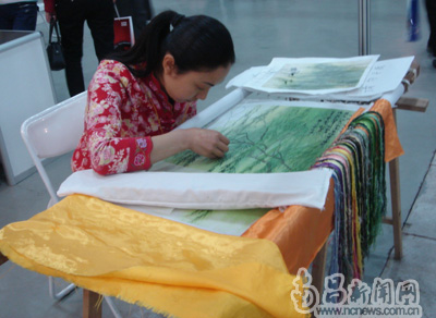 在主館內(nèi),蘇州鎮(zhèn)湖繡娘現(xiàn)場(chǎng)制作表演了家裝繡品;來(lái)看自北京眾多著名書畫家現(xiàn)場(chǎng)揮毫潑墨;最吸引觀眾眼球的是那價(jià)值上千萬(wàn)元的十幾套不同風(fēng)格的杭州紅木家具,這同時(shí)也為喜愛(ài)古典家具的觀眾提供了收藏和家庭裝飾的機(jī)會(huì)。在江西工藝美術(shù)展區(qū)的B館內(nèi),有景德鎮(zhèn)陶瓷、婺源龍尾硯、南昌漆畫、木雕、竹雕等著名工藝品種,讓參觀者領(lǐng)略了全省各地的民間工藝絕活。