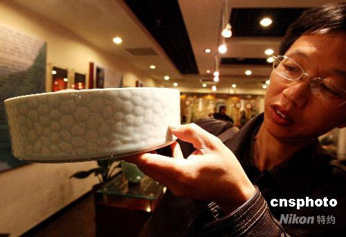 4月25,中國(guó)龍泉青瓷珍品展在北京合璧興陶瓷藝術(shù)館舉行,龍泉青瓷以獨(dú)創(chuàng)的粉青、梅子青釉色而著稱,龍泉哥窯有“金絲鐵線”之美稱,列為宋代五大名窯之一;而龍泉弟窯則以晶瑩潤(rùn)澤的青釉聞名天下,被譽(yù)為“青瓷之花”。是次展覽是由中國(guó)陶瓷工業(yè)協(xié)會(huì)及浙江省龍泉市政府主辦,毛正聰、徐定昌、陳愛明等十余位當(dāng)代大師紛紛創(chuàng)作并燒制青瓷作品。圖為珍品《期盼》則以?shī)W運(yùn)比賽場(chǎng)館國(guó)家游泳中心水的立方為設(shè)計(jì)藍(lán)本,內(nèi)部釉層飽滿晶瑩宛如水波,外部配以水分子外形的紋飾,將浙江龍泉的傳統(tǒng)青瓷文化與現(xiàn)代奧運(yùn)文化相結(jié)合,形成了人們對(duì)水的立方的記憶載體,表達(dá)了對(duì)奧運(yùn)的向往和期盼,完全契合北京奧運(yùn)會(huì)綠色、科技、人文的三大核心理念。