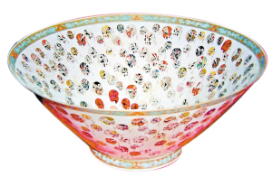吳錦華立志要“做一些別人沒有做過的事情”,在傳統(tǒng)題材中融入現(xiàn)代風(fēng)格。在日復(fù)一日的艱苦摸索中,他成功了,1992年,他創(chuàng)作出了后來震驚整個(gè)工藝美術(shù)界的“蓋世無雙臉譜碗”。那是在一只直徑87厘米的瓷質(zhì)薄胎大碗上,繪出448個(gè)造型各異的臉譜。那只碗幾乎耗費(fèi)了他一年的時(shí)間,那時(shí)候,他每天一早就來到工作室,對(duì)這吹彈得破的薄胎大碗,殫精竭慮,有時(shí)候一整天才能完成一兩個(gè)臉譜。最難的是倒置繪畫不易行筆,臉譜之間的結(jié)構(gòu)也令他頗費(fèi)躊躇,等到大作完成的時(shí)候,他幾乎要暈倒在地。