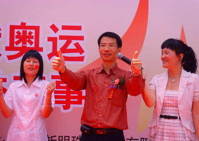 簡(jiǎn)總帶著工作小組還為現(xiàn)場(chǎng)市民指導(dǎo)做奧運(yùn)姿勢(shì)”中國(guó)加油 奧運(yùn)加油”