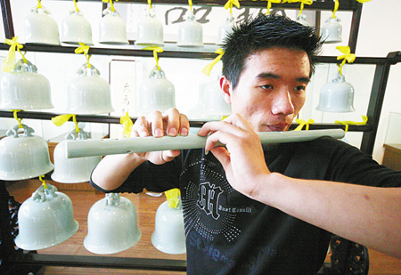 為了每一個(gè)“標(biāo)音”,他不知花費(fèi)了多少心思和功夫。他曾連續(xù)180余天沒(méi)有找出一件標(biāo)準(zhǔn)音質(zhì)的瓷品,只能全部砸掉重來(lái)。“有時(shí)候僅僅差幾毫米的釉度,音質(zhì)就不一樣了。”