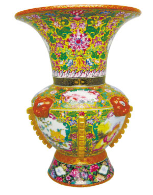 雍正御制琺瑯彩瓷出戟尊。上下四道開光,其中肩部四開光為胭脂彩和藍(lán)料彩山水畫;腹部四開光為花鳥和西洋人物。此瓷可謂集燒造工藝、繪畫藝術(shù)、捏塑藝術(shù)等于一體的琺瑯彩瓷藝術(shù)精品,為國內(nèi)外所罕見。