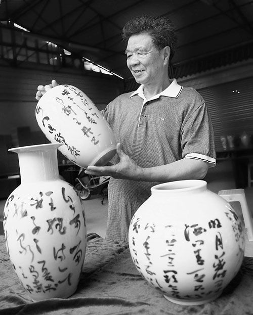 中國工藝美術(shù)大師夏侯文看著剛燒制成功的書瓷作品,臉上露出了滿意的笑容。6月初,夏侯文家來了中國書協(xié)副主席聶成文、新疆書協(xié)主席于小山、中國書協(xié)篆刻委員會委員王丹三位參加“名家寫名瓷”活動的書法家,共同創(chuàng)作了一批書瓷作品。夏侯文說,書法名家和青瓷大師攜手創(chuàng)作,不僅擴(kuò)大了龍泉青瓷知名度和文化內(nèi)涵,而且提升了青瓷作品的價值。