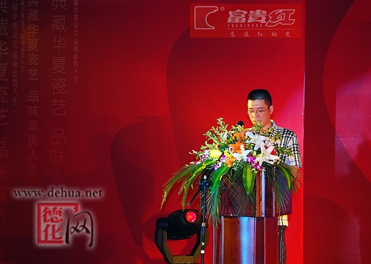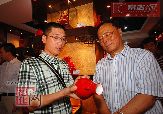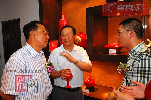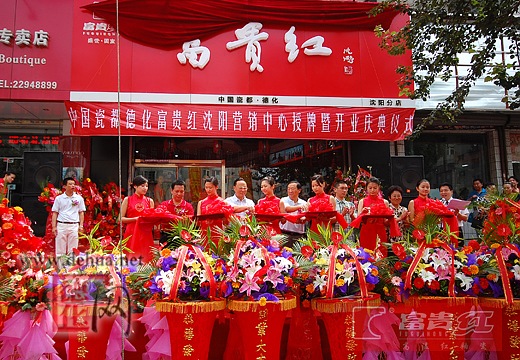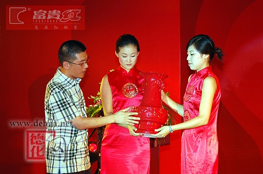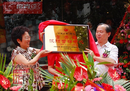 6月21日,海峽兩岸關(guān)系協(xié)會(huì)會(huì)長陳云林贈(zèng)送給海峽交流基金會(huì)會(huì)長江丙坤的見面禮富貴紅《兩岸同根》高溫紅釉陶瓷精品如期登陸沈陽,同時(shí),中國瓷都·德化富貴紅沈陽營銷中心也在同一天授牌開業(yè)。原遼寧省人大主任王懷遠(yuǎn),原遼寧省人大副主任郭大為,德化縣副縣長黃耀昆,德化縣政府助理調(diào)研員黃發(fā)建,及沈陽市政府各級(jí)領(lǐng)導(dǎo)等出席授牌儀式并剪彩。