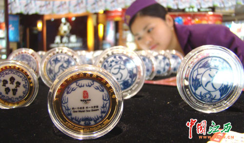 青花瓷、剪紙、金銀章、北京奧運會項目圖標……首次將青花瓷、剪紙等中國最典型的文化符號和奧林匹克精神創(chuàng)意融于一體的奧運特許紀念品“奧運青花瓷金銀紀念章”由北京奧組委授權(quán)發(fā)行。整套紀念章的青花瓷全部在景德鎮(zhèn)燒制完成,所有的設(shè)計和燒制均出自大師之手。