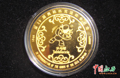 在景德鎮(zhèn)市周六福鉆石珠寶店拍攝到的“奧運青花瓷紀念金章”正面“吉祥物”。
