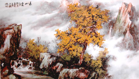 “中華陶藝村”顧名思義,是個(gè)不同尋常的瓷苑高地,薈萃了景德鎮(zhèn)數(shù)十位重量級(jí)陶瓷藝術(shù)家。這個(gè)民間社團(tuán)性的“村長(zhǎng)”大概非任命而是公推的。身為景市美術(shù)家協(xié)會(huì)副主席的實(shí)力派陶藝家龔循明,原本對(duì)現(xiàn)在泛濫貶值的各種頭銜不屑一顧,卻頂起了這無(wú)級(jí)別卻有份量的名頭。在他的工作室里,龔循明剛好完成了一幅大瓷板風(fēng)景畫,讓我眼睛一亮:構(gòu)圖獨(dú)特、意蘊(yùn)深遠(yuǎn),自不必說(shuō);光是畫面的造型語(yǔ)言和筆墨技法,就包含了東西方原本各異但被此畫融合得渾然一體的多種繪畫元素,使人有既熟悉又陌生的感覺,一種全新的審美感覺。龔先生說(shuō):“明代大畫家石濤的‘筆墨當(dāng)隨時(shí)代’箴言,應(yīng)是每個(gè)有追求的藝術(shù)家的創(chuàng)作準(zhǔn)則。我不愿意從題材到技法都重復(fù)古人,真正的陶瓷藝術(shù)家應(yīng)該師古而不泥古,借鑒而不崇洋,每個(gè)時(shí)代都要努力超越和創(chuàng)新。”他還說(shuō),10多年來(lái),一直在努力探索陶瓷山水畫的新路子。比如,這幅山水畫中既有線條、皸法等傳統(tǒng)筆墨,也有西方油畫的色塊技法……