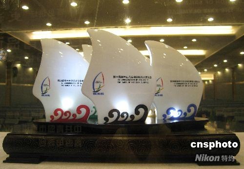 為慶賀并銘記二00八北京奧運會暨青島奧帆賽,以體現(xiàn)“奧運揚帆、五洲傳情”為主題的第二十九屆奧林匹克運動會帆船比賽紀念收藏品骨質(zhì)瓷“揚帆情”,七月二十八日在青島國際新聞中心舉行首發(fā)式。圖為其展示品。