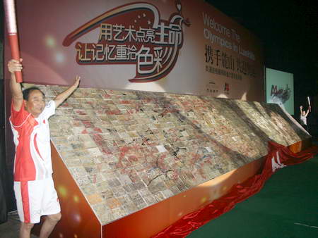 孫莉介紹說,2008塊瓷板就是2008份對奧運的祝福,這些瓷板通過拼裝組合后由成都本土藝術(shù)家完成后期加工創(chuàng)作并整體上釉,最終制成了這件永久留存的藝術(shù)品。當(dāng)天晚上,兩位奧運火炬手與來自災(zāi)區(qū)的孩子及成都藝術(shù)家一起為奧運瓷板墻拼上了最后八塊瓷畫,從而完成了這件具有特殊意義的奧運祝福瓷板墻。
