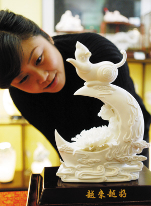 一名顧客在觀賞用白瓷燒制的鼠年吉祥物“越來越好”。當(dāng)日,“德化窯精品瓷器展”島城亮相,近百件來自福建德化窯的“中國白”與“鼎晟紅”瓷器在閩江路錢匯工藝品廳開始展出。記者看到,這尊《越來越好》的白瓷工藝品,設(shè)計(jì)者把一只可愛的小老鼠(俗稱:耗子)放置在一輪彎彎的月亮上,預(yù)示著我們的生活“越來越好”。據(jù)該店經(jīng)理牟女士介紹,福建省德化縣是中國的三大古瓷都之一,古代以燒制“中國白”而聞名中外,新近出水的南海一號(hào)宋代沉船上,就發(fā)掘出不少出自該縣的“中國白”工藝品。“中國白”不僅具有收藏價(jià)值,而且是收藏品中的珍品。它既能給居家增添文化氛圍和美的享受,又能給人們帶來增值效應(yīng),因此,歷來備受人們的青睞。