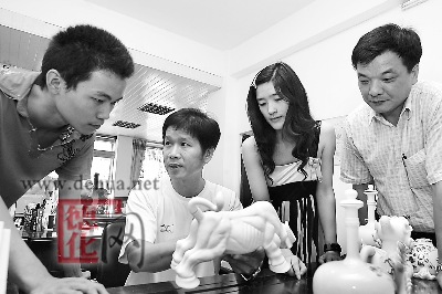 近年來,德化縣利用臺(tái)灣在高溫能量陶瓷科技方面的優(yōu)勢,營造適應(yīng)臺(tái)資企業(yè)發(fā)展的產(chǎn)業(yè)環(huán)境。目前,已有8家臺(tái)資陶瓷企業(yè)落戶德化。圖為臺(tái)灣聯(lián)宏科技德化辦事處邱文新博士(左二)與德化陶瓷企業(yè)技術(shù)人員研究高溫能量陶瓷。