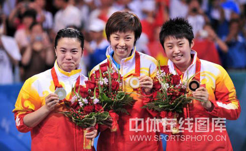 北京時間8月22日晚,北京奧運會乒乓球比賽繼續(xù)在北京大學體育館進行。在女子單打的決賽中,張怡寧在先失一局的情況下連扳四局,以4比1逆轉擊敗王楠,蟬聯奧運會女單金牌,王楠得到銀牌。郭躍在之前的季軍戰(zhàn)中擊敗新加坡的李佳薇得到銅牌,中國三名選手包攬了金銀銅牌。本場比賽的五局比分是8比11、13比11、11比8、11比8和11比3。