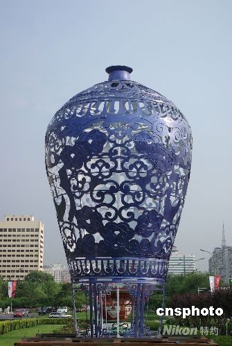 一只裝飾清秀素雅的高大“青花瓷”矗立在北京長安街上,給北京奧運會更添幾分中國色彩。 中新社發(fā) 九州 攝