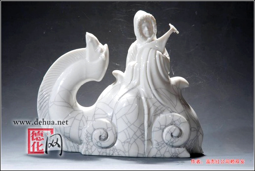 這僅僅只是一個平凡而美麗的古代女子。德化白瓷晶瑩剔透的材質,清麗、明朗,于人物是快樂和愉悅,是玉壁般的青春生命。造形形體間流動旋轉的線,柔順和緩的面,舒展著人物形象含蓄、典雅的東方女性之美。人物座下的駱駝也被裝飾化了,情感化了,成了造形的有機部分,如同形成人物姿態(tài)的懷抱琵琶。裂紋釉的虛虛實實、忽走忽滯,這是創(chuàng)作者有意在表現工藝美感和淡化主題意圖,言外意境氣氛的營造本是東方藝術的喜好。