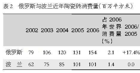 2006年俄羅斯與波蘭陶瓷墻地磚消費量在全球排名分別是第9位和第17位!