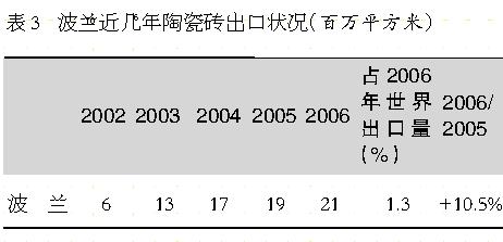 波蘭陶瓷墻地磚工業(yè)得到迅速發(fā)展,在滿足國內(nèi)不斷增長的需求的同時不斷減少進口,用國產(chǎn)磚替代進口磚,波蘭還積極地發(fā)展出口,2006年波蘭出口陶瓷墻地磚增加到21百萬平方米。