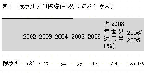 俄羅斯進口陶瓷墻地磚,在2006年也大幅度增長,達到45百萬平方米,相對于2005年增長29%,這些進口陶瓷磚中包括從鄰邦白俄羅斯進口14百萬平方米,從中國進口12百萬平方米,10百萬平方米從西班牙進口,6百萬平方米從意大利進口。
