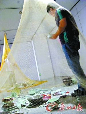 三張懸掛起來(lái)的漁網(wǎng),網(wǎng)中攤放著各種瓷器,韓國(guó)陶藝藝術(shù)家金光石鉆進(jìn)網(wǎng)中,平靜地將一件件完整的瓷器往地上砸,刺耳的碎裂聲中瓷器碎成片片……11月8日上午,莞城美術(shù)館“反芻”陶藝展覽開(kāi)幕,開(kāi)幕式上行為藝術(shù)首次亮相東莞,但不少觀展者都紛紛表示對(duì)這次行為藝術(shù)“沒(méi)看懂”。