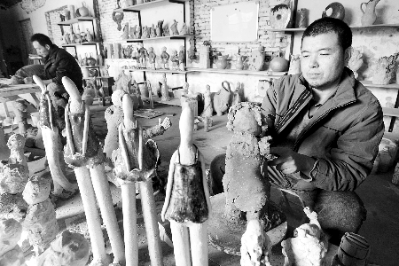 李紅斌從小就喜歡捏各種泥人,后來考上了河南師范大學的美術專業(yè),打理生意之余,為了有地方能夠致力于自己的陶藝,他在石佛村特意租了這個地方制作作品,還有朋友替他做了陶窯。他的屋子里擺了上千部作品,有事沒事,他就會來到這里,讓腦子中的形象變成活生生的陶瓷物品,其中他最滿意的作品就是“黃河老漢”:叼著煙斗的老農民、手扶拐杖的老農民……他說,從小生長在鄭州農村,小時候那些景象讓他印象深刻,用雙手做出來,似乎是“回到小時候的美好時光”。而他只有6歲的小兒子,也在耳濡目染之下做成了可愛的陶瓷“奧特曼”、“小飛機”,他們家里的藝術品大多是自己做成的。李紅斌說,他的作品不準備出售。