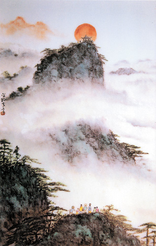 汪平孫是汪家的長孫,自幼隨父輩習畫。新中國成立后他考上大學,先學陶瓷藝術,后攻中文,再又回頭從事陶瓷繪畫。亦文亦藝的經(jīng)歷,為他全面繼承汪野亭創(chuàng)立的汪派山水畫風,創(chuàng)造了良好的條件。欣賞他的瓷畫山水,不僅可領略其祖父瓷畫的風神,仔細品味,還能發(fā)現(xiàn)他豐富和發(fā)展了“汪派山水”。其深山訪幽類、游春賞水類等古典意趣的山水瓷畫,不僅其祖父風貌宛然,且在蒼茫、厚重處似更擅勝場,如65號作品粉彩山水中堂瓷板《幽谷春深》等,蒼茫中見厚重。同時,在作品現(xiàn)代內(nèi)容和意趣的注入方面,也能不時看到佳作。如83號粉彩山水瓷板《平孫寫意》,一眾游人在深山茂林中觀一輪紅日的意趣。而106號粉彩山水瓷板《發(fā)揚革命傳統(tǒng)》尤妙,傳統(tǒng)山水主導的畫面下巧妙融入政治題材,意境新奇又渾然天成,時代感躍然瓷上。即使他著意創(chuàng)作的傳統(tǒng)類山水畫,自出新意的佳作也不少。如73號《墨彩山水瓷板》,寫唐人韋應物“獨憐幽草澗邊生”的詩意,全用禿筆勾勒,橫拖斜擦、筆意恣肆,極富文人水墨畫之韻味,有焦墨山水之況味,又因充分運用了油料的浸潤、揮發(fā),加上燒制時爐溫控制得妙,從而使整個畫面呈現(xiàn)氤氳之氣,唐詩韻味濃郁。