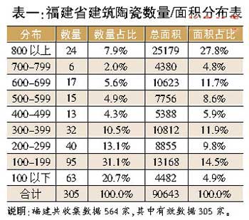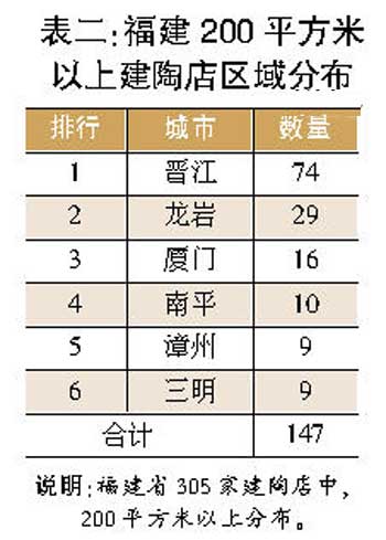 從區(qū)域分布來看(詳見表二),晉江的建筑陶瓷商戶無疑是福建二、三級市場的老大,在調(diào)查的305家建陶店中,200平方米以上陶瓷店僅晉江就超過了20%,而龍巖、廈門則居于其后。商家們普遍表示,隨著農(nóng)村市場的進(jìn)一步開發(fā),晉江、龍巖等地區(qū)將成為福建地級陶瓷市場的發(fā)展重點(diǎn)。