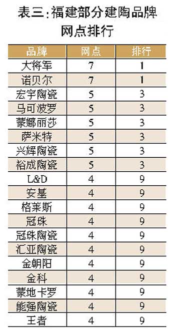 據(jù)本報調(diào)查發(fā)現(xiàn),在福建的省會城市福州聚集了諸多知名陶瓷衛(wèi)浴品牌,而在二、三級市場則相對有所削弱。在調(diào)查的品牌中,諾貝爾和大將軍領(lǐng)先于其它品牌而位列網(wǎng)點(diǎn)排行榜首。宏宇、蒙娜麗莎、馬可波羅等品牌則暫居第二。而在前10名中,佛山品牌則占到了80%份額(詳見表三)。