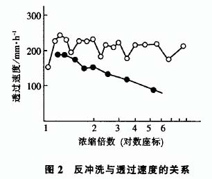 (1) 砂石過(guò)濾器與陶瓷膜過(guò)濾器的比較。砂石過(guò)濾器容易堵塞, 不能再生, 使用時(shí)間短,1年就需更換內(nèi)部濾砂。陶瓷膜分離器使用一段時(shí)間后也會(huì)堵塞, 用熱水反沖洗是一種非常有效的再生方法。當(dāng)陶瓷膜分離器阻力超過(guò) 1kPA 時(shí), 打開(kāi)蒸汽和水反沖洗 15Min, 就能夠恢復(fù)內(nèi)部填料的通透性, 使過(guò)濾性能恢復(fù)到原來(lái)的水平。圖 2 是反沖洗與透過(guò)速度的關(guān)系, 用熱水反沖洗不僅能除去覆蓋在填料表面的濾餅油渣, 還能除去膜孔中的細(xì)小顆粒, 使透過(guò)速度恢復(fù)到原有水平。