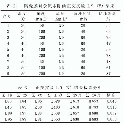 由極差分析可知, 影響陶瓷膜除油效率的因素依次為: 濃度、流量、反沖時(shí)間、溫度。最佳操作條件確定為: 溫度=50℃, 流量為額定流量 (本實(shí)驗(yàn)所采用的陶瓷膜過(guò)濾器的額定流量為 1M3/h), 反沖時(shí)間=20Min, 濃度越高除油效率越高。