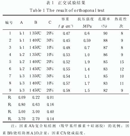 對(duì)采用正交試驗(yàn)燒制成的9組過濾片取樣測(cè)量體積、稱重, 獲得容重并用排水法測(cè)其孔隙率, 樣品的熱震性是通過電爐將樣品加熱到1 100 ℃, 放入15 ℃水中急冷, 取出并放入電爐中, 升至1 100 ℃保溫10 MIN后再急冷; 若表面出現(xiàn)宏觀裂紋, 則樣品為完全熱震破壞,記下循環(huán)次數(shù)。采用SHIMAdzu ( 島津) AT-I250KN型精密萬能試驗(yàn)機(jī)測(cè)試抗壓強(qiáng)度, 用PHIIIPS X'PerT MPD PrO型X射線衍射儀進(jìn)行物相組成研究和日產(chǎn)JSM-5610IV型掃描電鏡觀察其斷口形貌。