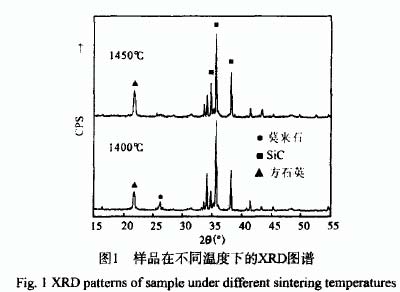 燒成溫度越高, 產(chǎn)生的液相越多, 液相的粘度越低。這樣, 更多的液相滲入孔中, 使得燒結(jié)體更加致密。但是在表1中, 樣品最高強(qiáng)度沒有出現(xiàn)在最高的燒結(jié)溫度1 450 ℃, 而是出現(xiàn)在1 400 ℃, 這一現(xiàn)象的出現(xiàn)是由于高的燒結(jié)溫度致使材料中的SIC相氧化程度高于較低的燒結(jié)溫度, 從而生成更多的方石英相如圖1,而方石英在冷卻過程中將發(fā)生大約3%的體積轉(zhuǎn)變, 這一轉(zhuǎn)變將給材料帶來一定的微裂紋[4],微裂紋的出現(xiàn)將對(duì)材料的強(qiáng)度造成一定的損害, 因而導(dǎo)致1450 ℃下燒結(jié)的樣品強(qiáng)度低于1400 ℃下燒結(jié)的樣品, 在1400 ℃下莫來石相的生成是材料強(qiáng)度提高的一個(gè)重要貢獻(xiàn)因素, 同時(shí)莫來石相也是高溫強(qiáng)化相, 對(duì)材料耐火度的提高具有很好的作用。