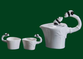 據(jù)德化陶瓷工藝師介紹,“團(tuán)團(tuán)圓圓”瓷壺為心形造型,高15厘米、寬18厘米;瓷壺蓋上雕有一頭黑白相間的熊貓,壺的把手為竹節(jié)形狀,頂端雕有一頭黑白相間的熊貓與壺蓋熊貓相對(duì)應(yīng),象征“團(tuán)團(tuán)圓圓、長(zhǎng)相廝守”。壺外配上兩只心形小茶杯,把手上也各雕有一頭憨態(tài)可掬的熊貓,與茶壺相呼應(yīng),表達(dá)了兩岸人民共盼闔家團(tuán)圓的美好愿望。