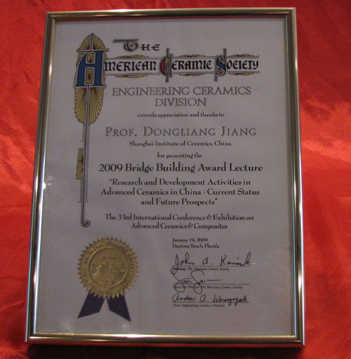 近日,美國陶瓷學(xué)會工程陶瓷分會授予中國工程院江東亮院士橋建獎(BridgeBuildingAward),這是該獎設(shè)立以來第一次授予中國材料科學(xué)家。2009年1月19—23日在美國佛羅里達(dá)州德塔納海灘召開的第33屆國際先進(jìn)陶瓷及復(fù)合材料會議(33rdInternationalConference & Exhibition of AdvancedCeramics&Composites)上,美國陶瓷學(xué)會工程陶瓷分會授予江東亮院士橋建獎(BridgeBuildingAward)。該獎是專門授予國際著名材料科學(xué)家,每年一名,以表彰他們對世界先進(jìn)工程陶瓷和陶瓷基復(fù)合材料等方面做出的杰出貢獻(xiàn)。江東亮院士應(yīng)邀在大會上作“R&DofAdvanced Ceramics Activities in China and Shanghai InstituteofCeramics Chinese Academy ofSciences”特邀報告。該報告介紹了中國和中國科學(xué)院上海硅酸鹽研究所在先進(jìn)陶瓷、陶瓷基復(fù)合材料、透明陶瓷、納米介孔材料、生物材料以及制備科學(xué)等領(lǐng)域所取得的重要進(jìn)展和貢獻(xiàn)。由于受到簽證延誤,報告由董紹明研究員代為宣讀并受到出席會議代表的廣泛好評。出席本次會議的世界各國代表達(dá)1200余人。江東亮院士長期從事先進(jìn)陶瓷及其復(fù)合材料的研究和發(fā)展工作,并做出了杰出貢獻(xiàn)。他涉及的研究領(lǐng)域有微晶結(jié)構(gòu)氧化鋁陶瓷、氧化鋁基金屬陶瓷、高純度氧化鋁陶瓷、高強(qiáng)度碳化硅基陶瓷及其復(fù)合材料、SiC/Si3N4梯度和層狀復(fù)合材料,并在水基流延成型和水基泥漿膠注成型領(lǐng)域頗有建樹。目前江院士的研究興趣集中在生物材料、透明陶瓷和納米陶瓷復(fù)合材料等。江院士始終致力于國際陶瓷間的合作與發(fā)展。發(fā)表學(xué)術(shù)論文250余篇,出版著作3本,擁有專利18項,獲主要獎項10余項,1993年被選為世界陶瓷科學(xué)院院士。