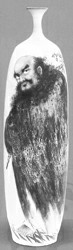 浦東雙季花藝的“永生藏瓷”陳列館內(nèi),有幾件表現(xiàn)嫉惡如仇的鐘馗和大氣凜然的達(dá)摩(見圖)瓷繪作品,給人以明快淋漓之感,它們是江西高級(jí)工藝美術(shù)師余冬保的近作。