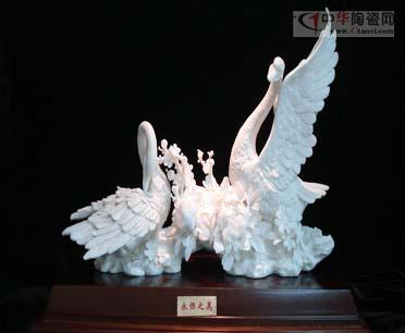 《永恒之美》取義于兩只白天鵝,這也是中國(guó)傳統(tǒng)美好的一個(gè)象征。兩只白天鵝悠閑自在,一只在為自己搔癢,一只展翅,她們?cè)谟盟齻冎g的和諧、溫馨詮釋著生命的美好,生活的美好。細(xì)看胎質(zhì)細(xì)膩,如脂似玉,瑩潤(rùn)如水,線條優(yōu)美柔和,這是結(jié)合德化獨(dú)特的“白如雪、潤(rùn)如玉、透如絹”的“中國(guó)白”的優(yōu)美瓷質(zhì),將作品雕刻得栩栩如生,假假真真,真真假假,展示出了高潔、素靜淡雅的品質(zhì)。