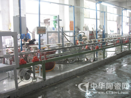 此施釉線采用先進(jìn)的配套設(shè)備,其流程滿足日用陶瓷生產(chǎn)工藝需要,技術(shù)成熟、運(yùn)轉(zhuǎn)穩(wěn)定,維修、維護(hù)方便簡單。特制的專用淋釉設(shè)備,徹底解決了以前障礙釉膜形成的瓶頸難題,實(shí)現(xiàn)日用陶瓷自動(dòng)淋釉,解決手工旋坯施釉造成的難以克服的諸多缺陷。專用的淋釉設(shè)備對(duì)釉水無特殊要求,釉水不需添加任何添加劑。而且全自動(dòng)擦腳釉,無需人工操作,擦腳干凈釉,不損耗坯件。