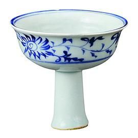 3、青花纏枝菊花紋高足杯,內(nèi)蒙古自治區(qū)文物考古研究所藏,高9.4厘米、口徑12.4厘米、底徑3.2厘米。內(nèi)壁飾暗花八寶紋,外壁腹部飾兩組纏枝菊,輔以弦紋。元人有愛(ài)菊的風(fēng)尚,大都的菊花非常昂貴,有“一本黃花金十鏹,富家菊譜簽銀榜”的記載。此杯所繪菊花紋,畫面疏簡(jiǎn),線條流暢,顯得生機(jī)勃勃。
