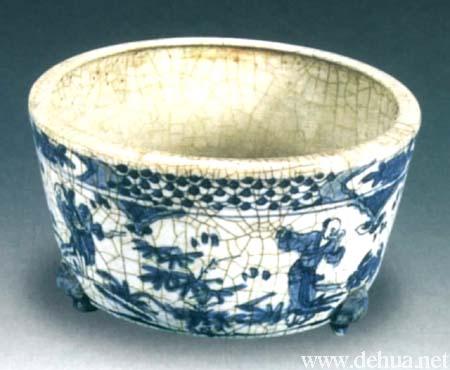明代中晚期興起的青花瓷目前所見(jiàn)主要有瓶、爐等器物,其青花色澤淺淡,藍(lán)中泛灰黑或藍(lán)中微紫。紋飾主要是人物和花草。其裝飾技法是手繪,用筆草率,構(gòu)圖簡(jiǎn)樸。所繪人物,衣裳多單薄,五官或模糊不清,如青花人物三足爐。是目前所見(jiàn)德化青花瓷中最完美的一件。