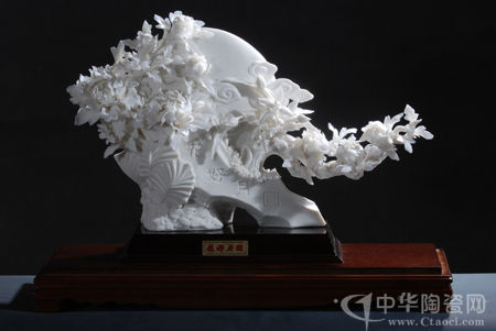 作品寬19寸,高11寸,造型和諧,以明月為主,配有牡丹、菊花等花卉,層次分明,精雕細(xì)刻,栩栩如生。她的瓷質(zhì)堅(jiān)實(shí)厚重,胎釉結(jié)實(shí)致密,俗稱“糯米胎”,瓷色潔白如雪,溫潤如玉,透明度好,是德化白瓷的上等瓷種。