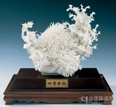 《四季爭艷》長39cm,寬18cm,高34cm,以德化特有的溫潤如玉的“中國白”為胎質(zhì),潔白細膩,素凈淡雅。作品主要通過牡丹、梅花、菊花等蘊含傳統(tǒng)美好意愿的花卉來表現(xiàn),每一朵瓷花都可以以假亂真,每一朵瓷花的盛開過程都是一種神奇,都是對生命的禮贊。四季的結(jié)合更彰顯出生命的繁華與生機,表達了對生活的熱愛之情。(蘇曉霞)
