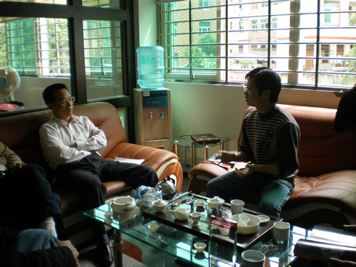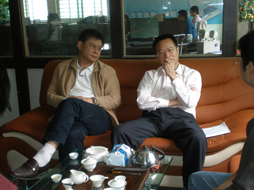 中華陶瓷網(wǎng)總經(jīng)理柯維太(右) 向州市科技局黨組成員、紀(jì)檢組長(zhǎng)——陳嘉祐(左)介紹