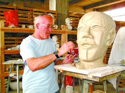 在工作營內(nèi),有一張臉笑得十分燦爛,這座瓷雕名為“笑臉”,他是3月份從上海來這里的法國雕塑家伊漢朗的“自雕像”。