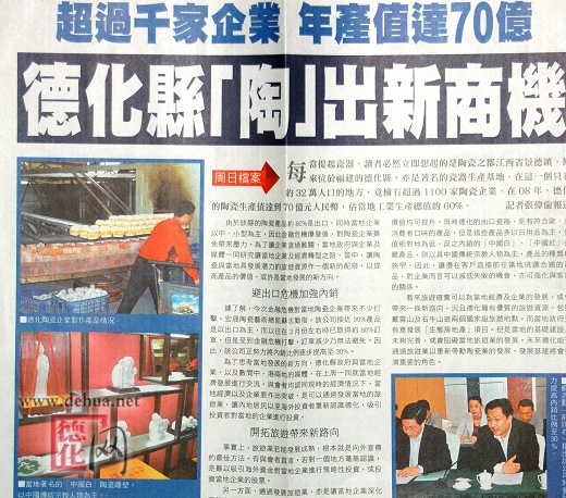 每當(dāng)提起瓷器,讀者必然立即想起的是陶瓷之都江西省景德鎮(zhèn),原來位于福建的德化縣,亦是著名的瓷器生產(chǎn)基地。在這一個(gè)只有約32萬人口的地方,竟擁有超過1100家陶瓷企業(yè)。在08年,德化的陶瓷生產(chǎn)值達(dá)到70億元人民幣,占當(dāng)?shù)毓I(yè)生產(chǎn)總值的60%。