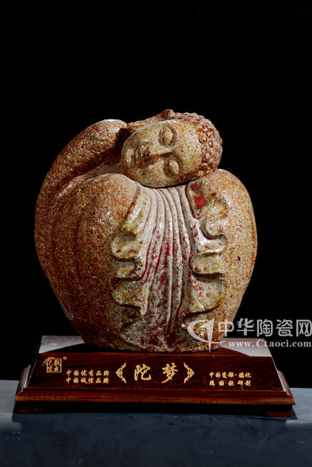 《福滿人間》彌勒佛雕像高28厘米、寬46厘米,雙手?jǐn)n于胸前作揖狀,肌膚顏色為鐵銹黃胎色,衣服為銅紅色與鐵銹黃釉面,笑容可掬,形象古樸!锻訅簟贩鹜拥裣窀28厘米、寬26厘米,佛陀雙手?jǐn)n抱托腮作眠狀,衣飾紋理和頭頂肉髻夾雜鐵銹黃與銅紅色釉,面相祥和,似在夢中作無限遐想。(蘇曉霞)
