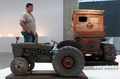 中國美術(shù)館委托中央美術(shù)學(xué)院雕塑系教授呂品昌策劃的“文思·物語——大陸當(dāng)代陶藝展”,6月3日在臺灣陶藝重鎮(zhèn)臺北縣鶯歌鎮(zhèn)揭幕。圖為一臺北觀眾在觀賞鈔子藝、鈔子偉兄弟仿上世紀(jì)五六十年代大陸農(nóng)用拖拉機(jī)制作的陶瓷作品《勞力士系列》。中新社發(fā)劉舒凌攝
