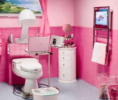 圖解:這是一款女性版豪華盥洗室,由美國Roto-Rooter潔具公司推出。其整體色調(diào)為粉紅色:“公主們”可以坐在粉紅色“寶座”(馬桶)上,一邊吹頭發(fā),一邊泡腳,一邊打開粉紅色的Sony筆記本上網(wǎng),或者玩WiiTennis( 日本任天堂生產(chǎn)的一款運動游戲機),而且對于很多女性朋友來說,既是電視、鏡子,又是毛巾架的多功能屏幕,更是不可多得的“寶物”,此前該公司曾推出男性版超級盥洗室,其中配置的電視屏幕是女性版的4倍大。