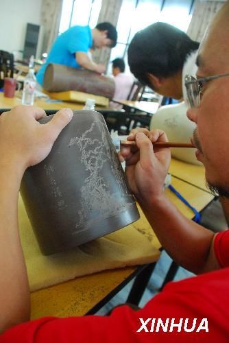 8月15日,一位選手參加宜興陶刻大賽。為傳承陶瓷文化,促進陶藝創(chuàng)新,培養(yǎng)和發(fā)現(xiàn)陶刻高手,8月15日,江蘇宜興陶刻大賽在宜興市陶瓷行業(yè)協(xié)會禮堂舉行,50余名中青年陶藝工作者參加了壺藝、陶盤、雜件、花盆等項目的角逐。
